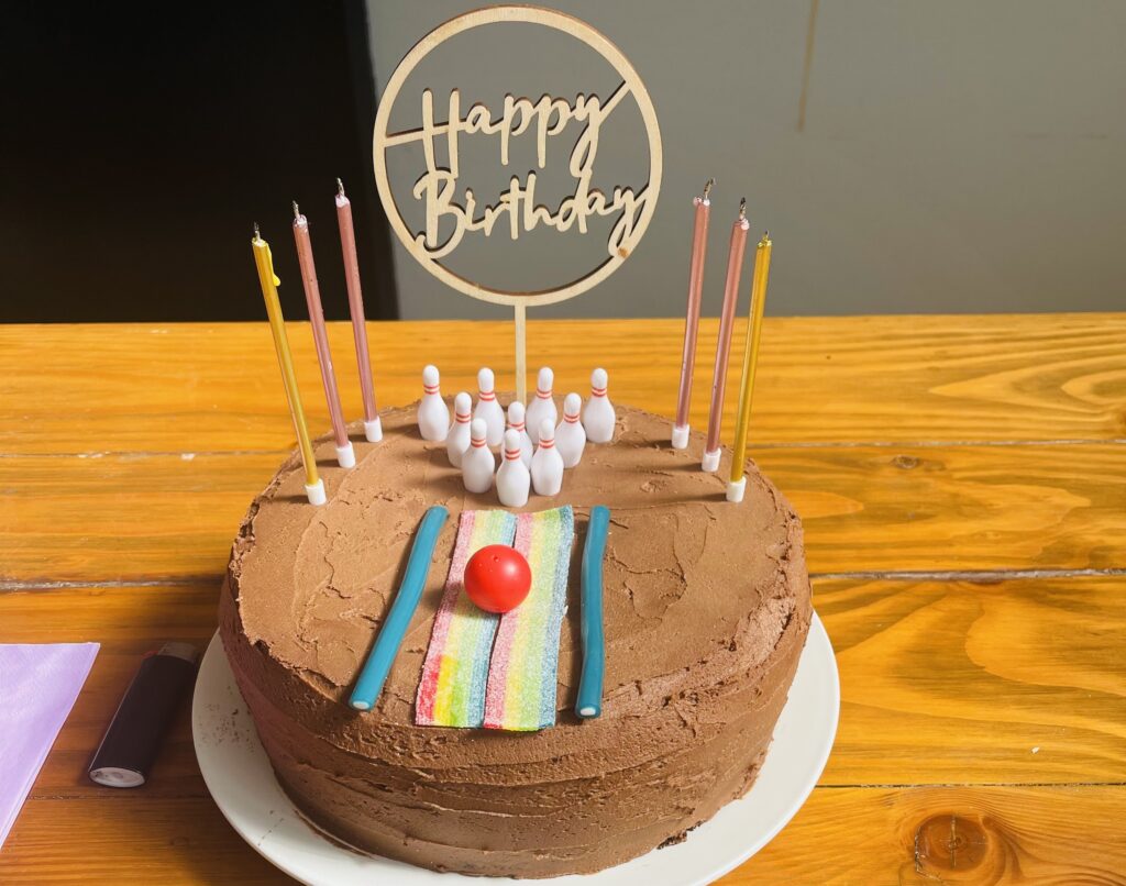 A dense chocolate mud cake, decorated with a bowling theme and pink or green candles